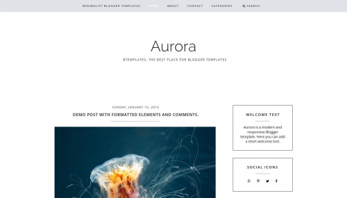 Aurora is a free premium blogger template with 2 columns, responsive design, seo friendly, right sidebar, minimalist, an exclusive design for Blogger, ads ready, footer columns, social bookmarking icons, drop down menu, related posts support, well designed threaded comments and simple look. Excellent template for blogs about books, business, fashion, health and beauty, photography or a personal portfolio site. Download Aurora for free in BTemplates.