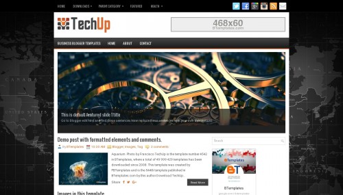 TechUp is a free blogger template adapted from WordPress with 2 columns, responsive design, right sidebar, ads ready, footer columns, slider, social bookmarking icons, posts thumbnails, tabs, drop down menu, breadcrumbs and related posts support. Excellent template for blogs about business, internet, news, science, software or travel. Download TechUp for free in BTemplates.
